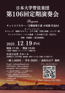 トップページ 2025.09.252025.09.29第106回定期演奏会のチケット購入はこちらから 一覧へ 最新のお知らせ 2025年9月25日 NEW! ホームページのリニューアル中です コンテンツ演奏会情報活動日誌楽団紹介団員募集本団の指揮者過去の演奏会一覧卒団生向けのページお問い合わせ